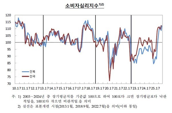 25일 한국은행 전북본부가 발표한 '2025년 11월 전북지역 소비자동향조사 결과'에 따르면, 이달 전북지역의 소비자심리지수(CCSI)는 112.3을 기록했다.